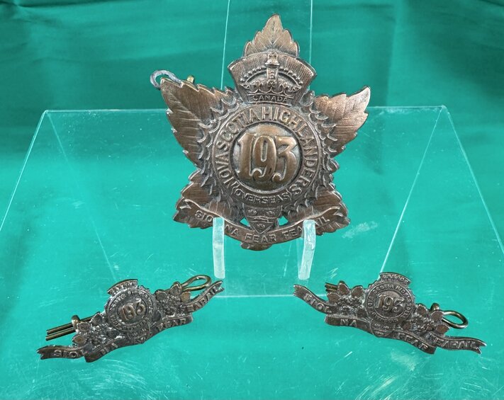 Very good plus condition matched copper finish set for the 193rd Highland  Battalion consisting of the or's cap badge and matching collars. Complete set ready to display.
