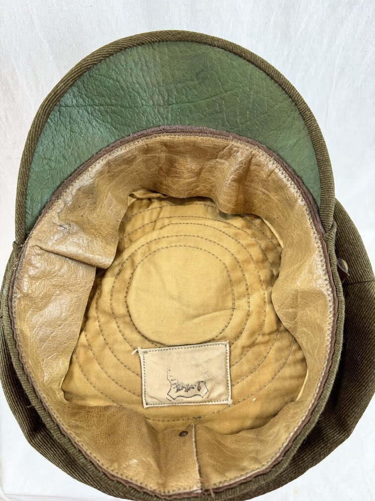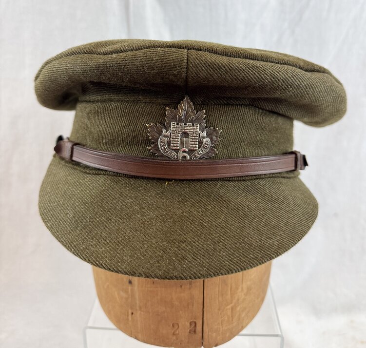 Excellent condition 6th Western Cavalry visor cap. Officers pattern visor with green fibre under visor. Fibre visor has an indentation for a thumb in the centre after much putting on and removal over the years. Both general list side buttons present. Two piece Hicks of London marked badge. Unfortunately can't make out the manufacturer. Likely a British made visor. No name unfortunately. Nice addition to a First War Canadian collection.