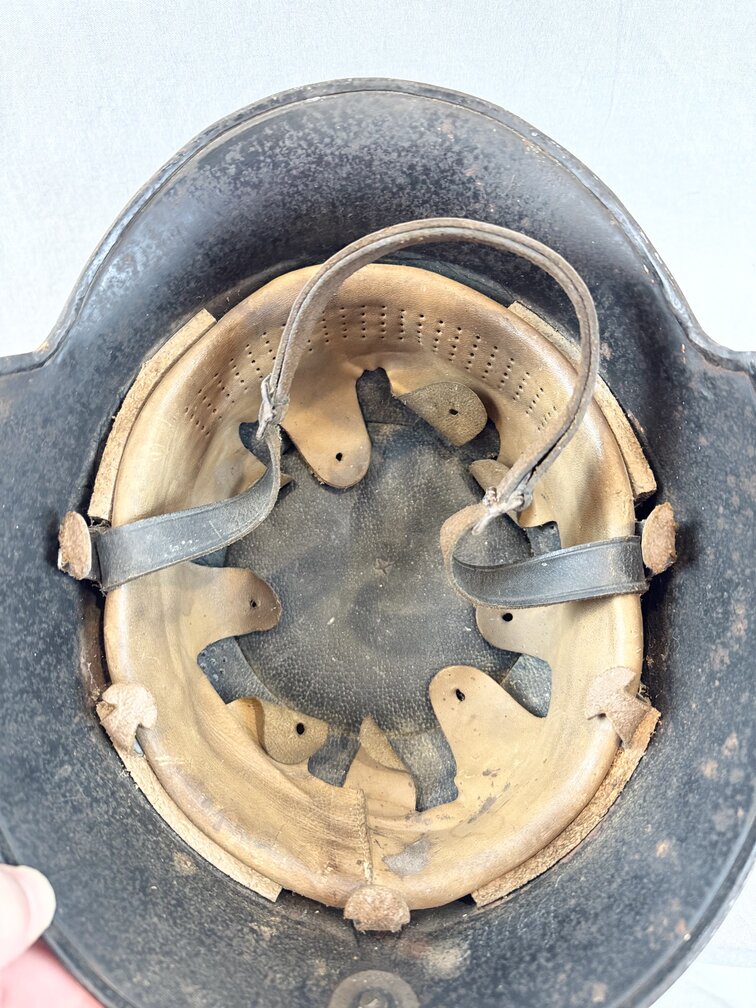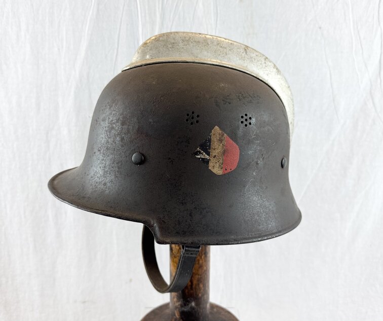 Nice complete example of an M34 pattern German Firefighters helmet. Liner and chinstrap present. 90% tri colour shield present but unfortunately only about barely 2% of the swaz decal remaining. Some overall surface rust.
