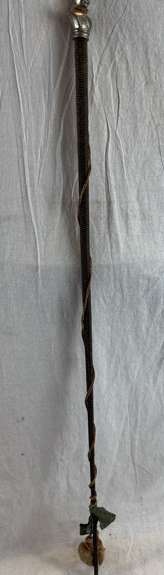 Approximately 34 inches in length. This reservists stick was a souvenir of a soldiers service time. Likely a prewar piece. A figurine at the top and a pair miniature trodells wrapped around the leather with cloth covered shaft. A unique piece.