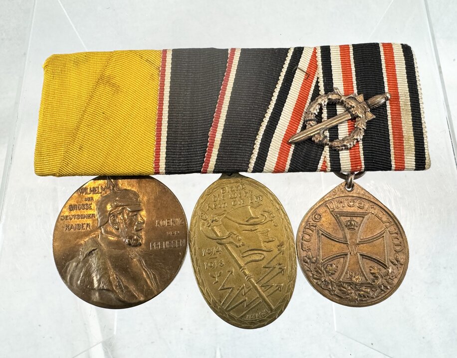 Interesting trio of German First War medals mounted as worn. Consists of the Jubilee medal, Kyffhauserbund veterans association medal and the Legion of Honour war medals mounted with sword and laurel leaf clasp for combatants. Nice untouched set.