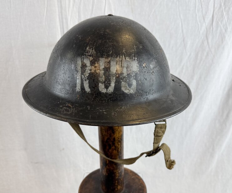 Good condition RUC helmet in very good plus condition. Basically a civilian production (holes near the chinstrap) British helmet with a dark blue paint and stencilled RUC to the front. Would date from the 40's-50's. Helmet is named. Rubberized liner is slightly stiff. Sourced in Derry, Ireland. Scarcer to find on this side of the pond.