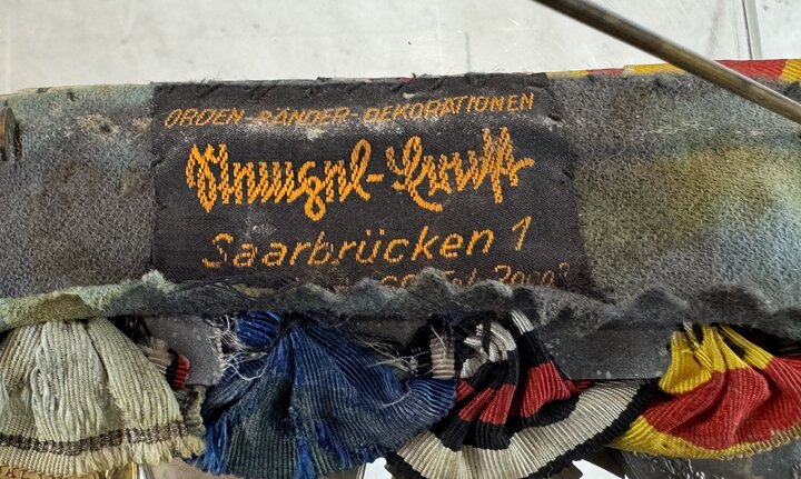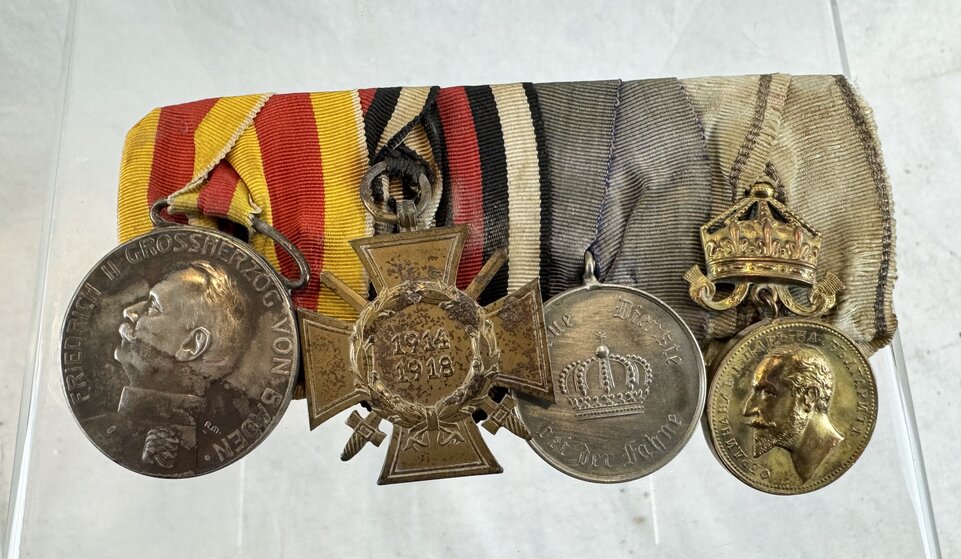 Less common four place medal bar consisting of the First War Baden service medal, honour cross with swords, 9 year long service and a Bulgarian merit medal. What's interesting is the shop that mounted the medals in Saarbrücken still has the label on the back. Nice First War representative for Baden.