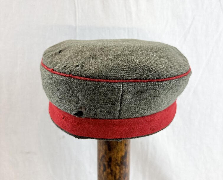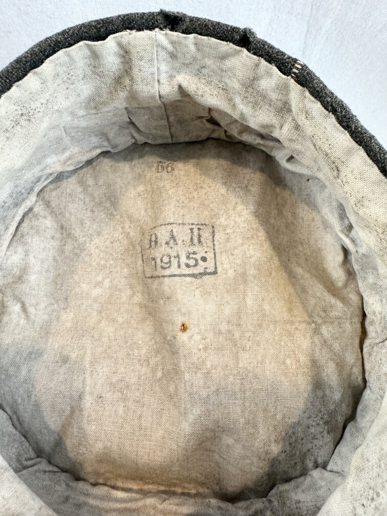 Good condition German 1915 dated field grey kradschen or field cap. Prussian version. BA ll 1915 stamped. Also stamped size 56. Possible paint touch ups on the kokarden. Overall a good specimen with some nips and field wear.
