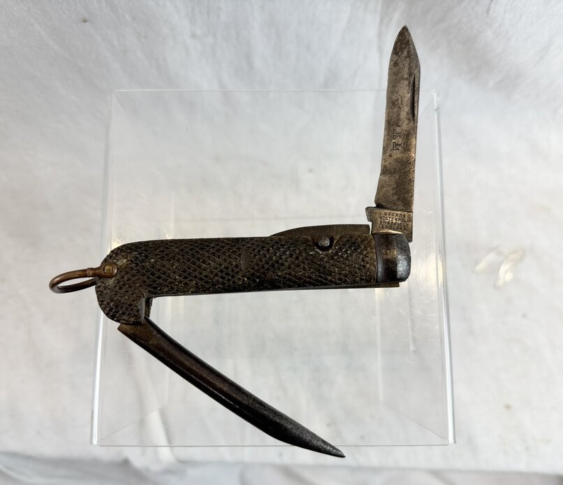 Canadian soldiers First War pocket knife. Manufacturer us George Wostenholm, Sheffield England. Small C broad arrow on the spike. Blade has been sharpened and reverse of grip has something applied to it for some reason. A nice First War Canadian issued piece.