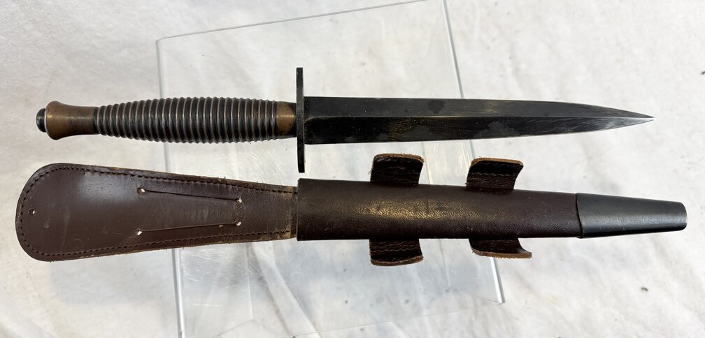 Excellent condition 3rd pattern FS fighting knife. Marked with a "2" on the pommel indicating 2nd mould pattern. Also marked with a broad arrow 21. Marked England as well indicating this was part of a 167 000 piece shipment after the Second War sent to the US as partial payment for lend lease. A great specimen.