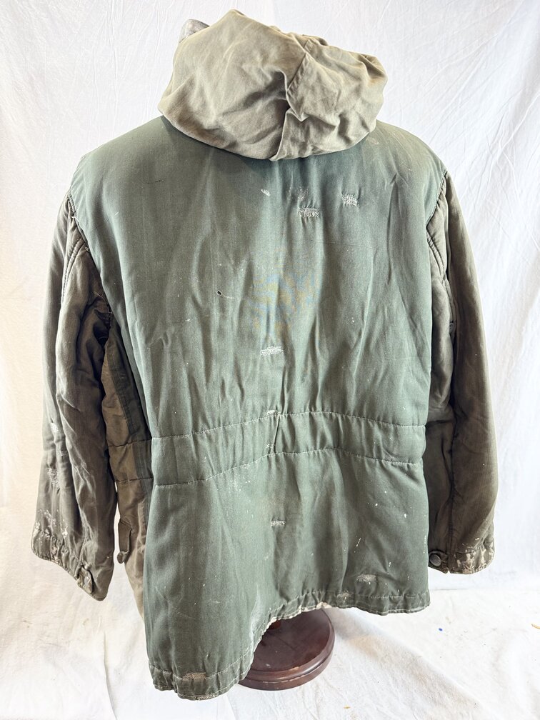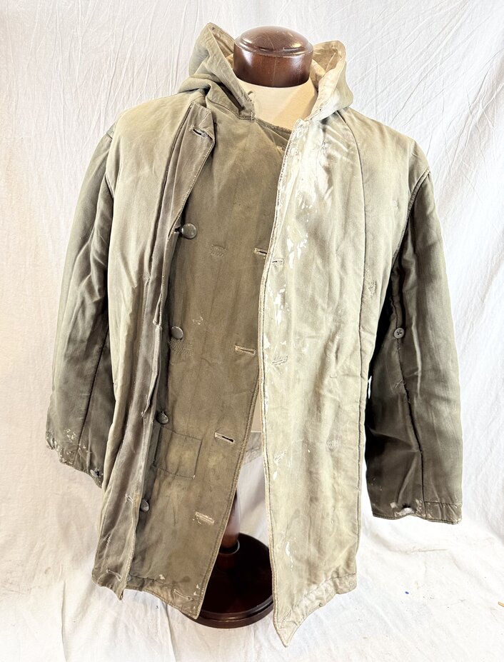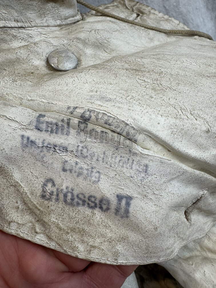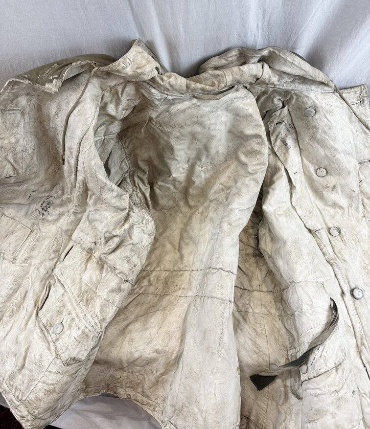 Absolutely stellar German 2nd War mouse grey reversible to white camo jacket. All buttons and straps present. Larger size. Has a thick overpaint on the white side usually seen on the winter gloves. Leipzig maker or refurbisher. Has field repairs giving it that salty been there look. Would be a great piece to throw on your Russian Front mannequin.