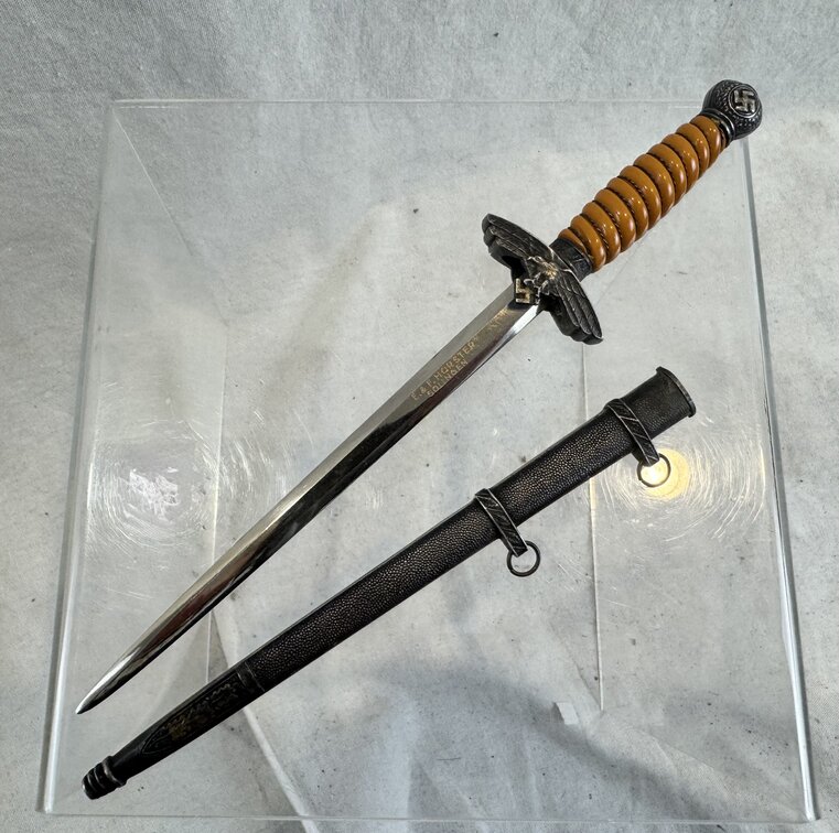 Wonderful and rare 2nd War Luftwaffe miniature dagger. Etched on the blade is the maker:"E&F Horster". I have owned a few of the army daggers before but never a 2nd model Luft. Excellent condition with it's original scabbard. Total length is 7 3/4 inches.
