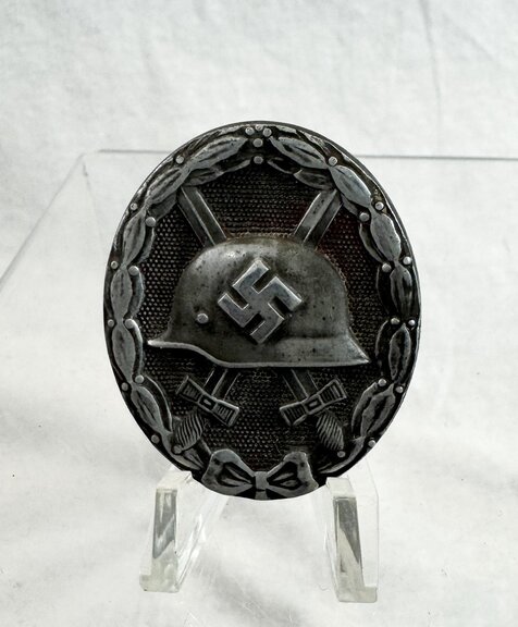 Typical flat back German 2nd War wound badge in silver. Marked 127 which corresponds to maker Moritz Hausch AG of Pforzheim. Very good but obviously worn condition.