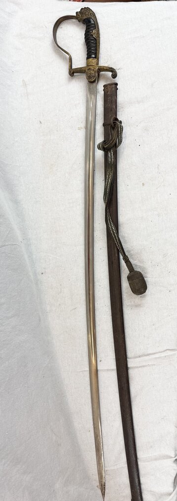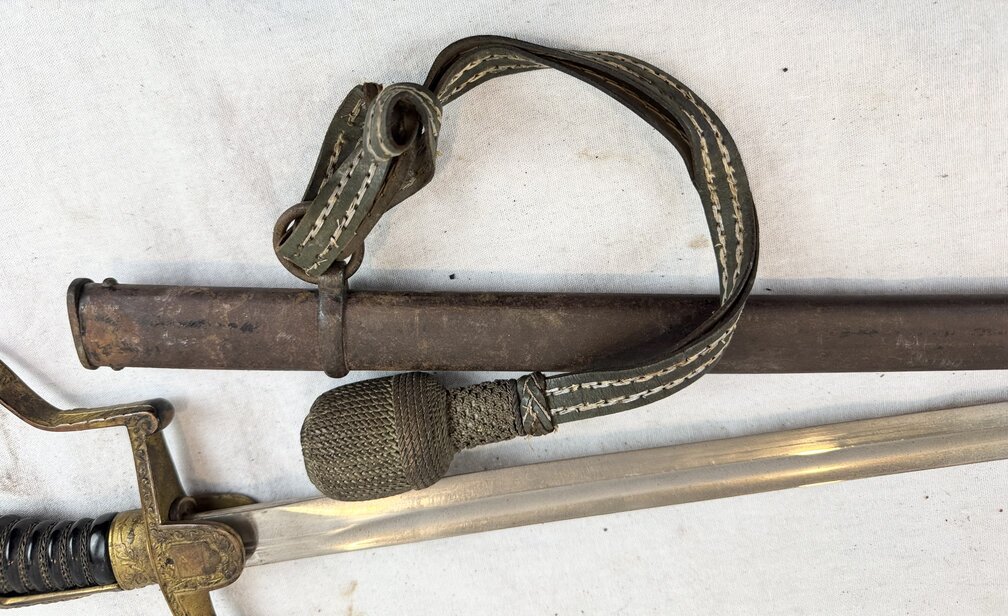 Overall decent condition. Lots of service rust on the scabbard. Appears that someone had glue over the swaz at some point. Blade is super clean. No markings on the blade. Comes with a sword not but incorrectly attached. Overall blade length is 32 inches. Needs a bit of a cleanup but will display nicely.