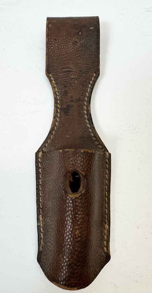 Minty brown pebbled leather First War bayonet frog. Typical First War construction without rivet and just stitching. No maker mark or date. Rarely seen in this condition.