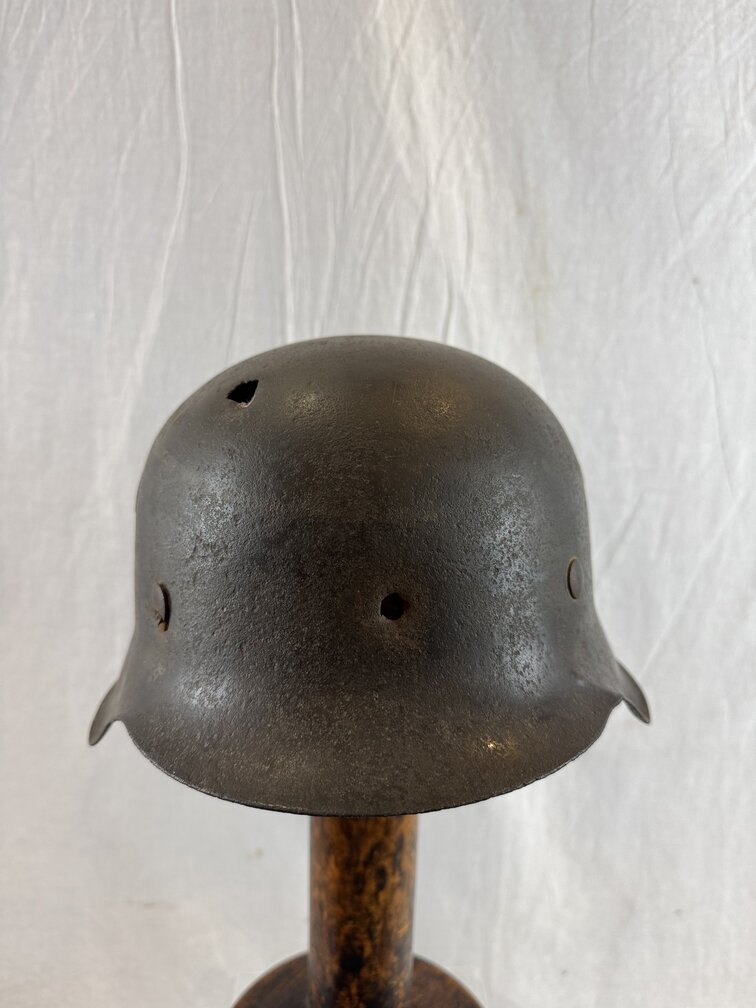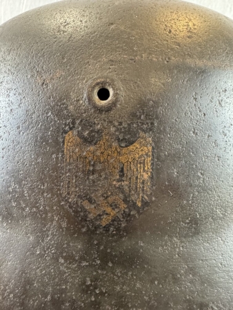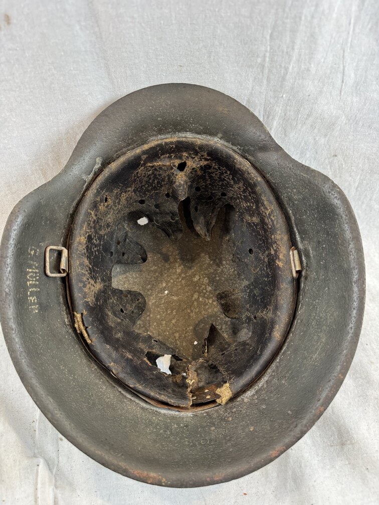 Battle damaged Kriegsmarine single decal M42. Has an entry and exit hole as well as some shrapnel damage. Still has its liner that is quite dark, possibly blood staining. True gold Kriegsmarine eagle still very clear. Named to G Müller.
