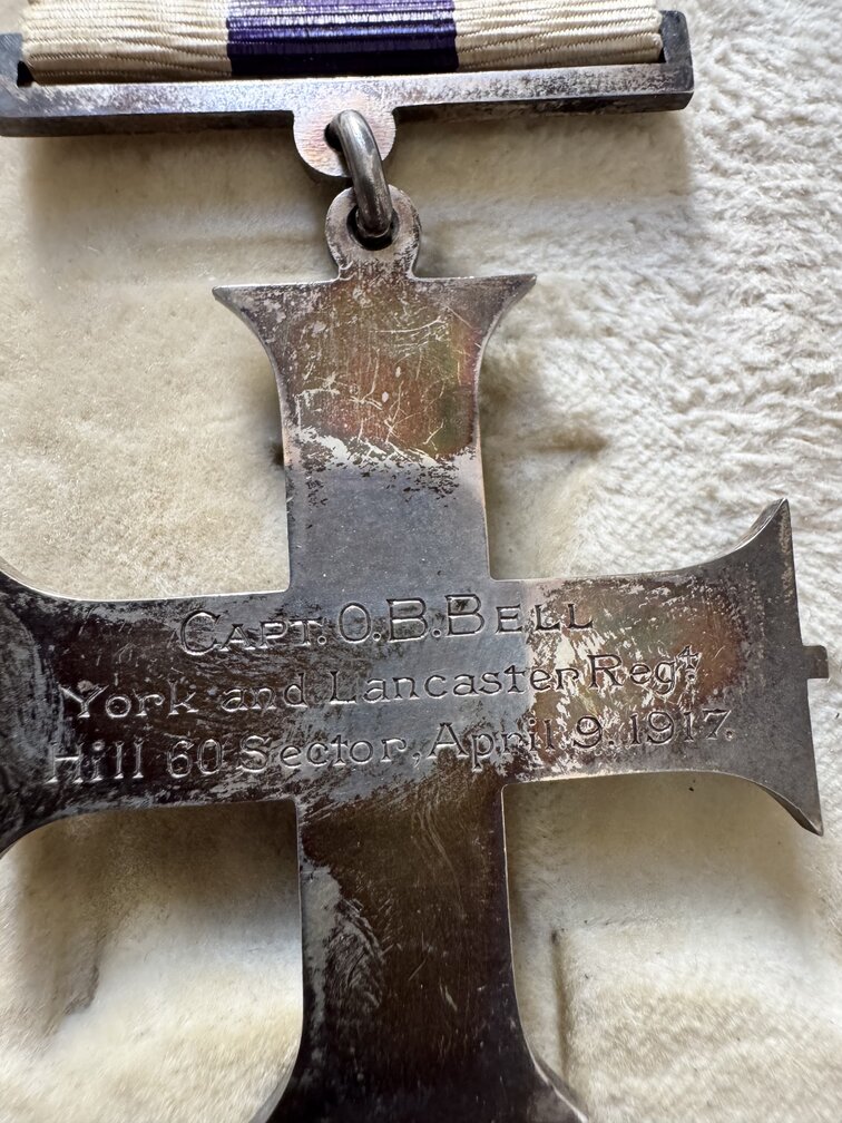 Excellent condition MC in original case. Engraved on the reverse is the following: Capt.O.B.Bell York and Lancaster Regiment Hill 60 Sector April 9th, 1917. No other medals came with unfortunately. Couple pages of research that comes with the medal.