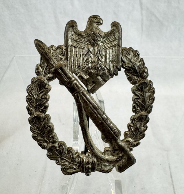 Excellent condition hollow back Infantry Assault badge in silver. Unmarked version. 90% finish.