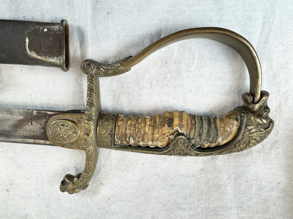 High quality lion head sword. Maker marked to J. Robrecht Hoflieferant (Royal Warrant Holder) Berlin. The most obvious defect on this sword is the shark skin grip covering is 98% absent revealing the wood grip underneath. Has glass eyes. Blade has some staining. No etching. A beautiful sword to a rarer maker that could use some TLC.