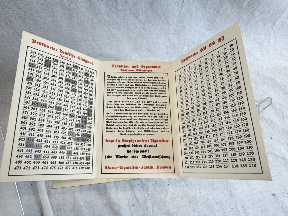 Bit of an unusual item. I imagine these are pretty scarce as no reason to keep them once you got your album completed. These are two checklist's for cigarette cards that would complete a cigarette card album. SA brand cigarettes funded the SA organization. A nice piece of propaganda history to accessorize your cigarette card albums.