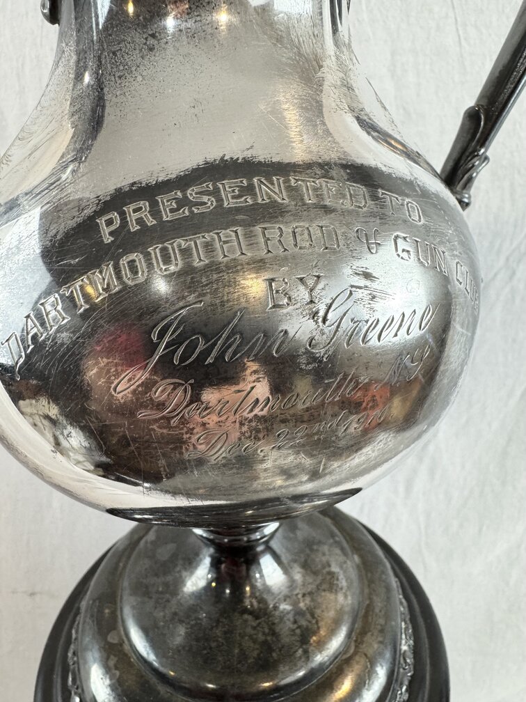 Very fine condition 1910 shooting trophy. Inscribed with the following: Presented To Dartmouth Rod & Gun Club by John Greene, Dartmouth, NS., Dec. 22nd, 1910. Can't read them so we played trophy. Silver plate trophy stands stands 15 inches tall when on its black wood base. Very decorative piece.