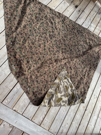 Excellent condition Austrian zeltbahn/poncho. Basically a copy of the 2nd War German version. These models have pea pattern camo on one side and stein tarn on the reverse. No holes or damage. All eyelets present.