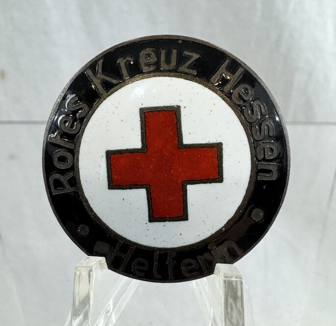 Early pre Nazi period Red Cross nursing sister's brooch for the state of Hesse. Maker mark on the reverse reads Klein u Quenzer AG, Oberstein. Enamel is undamaged. Measures approximately an inch and a quarter in diameter. Nice early piece