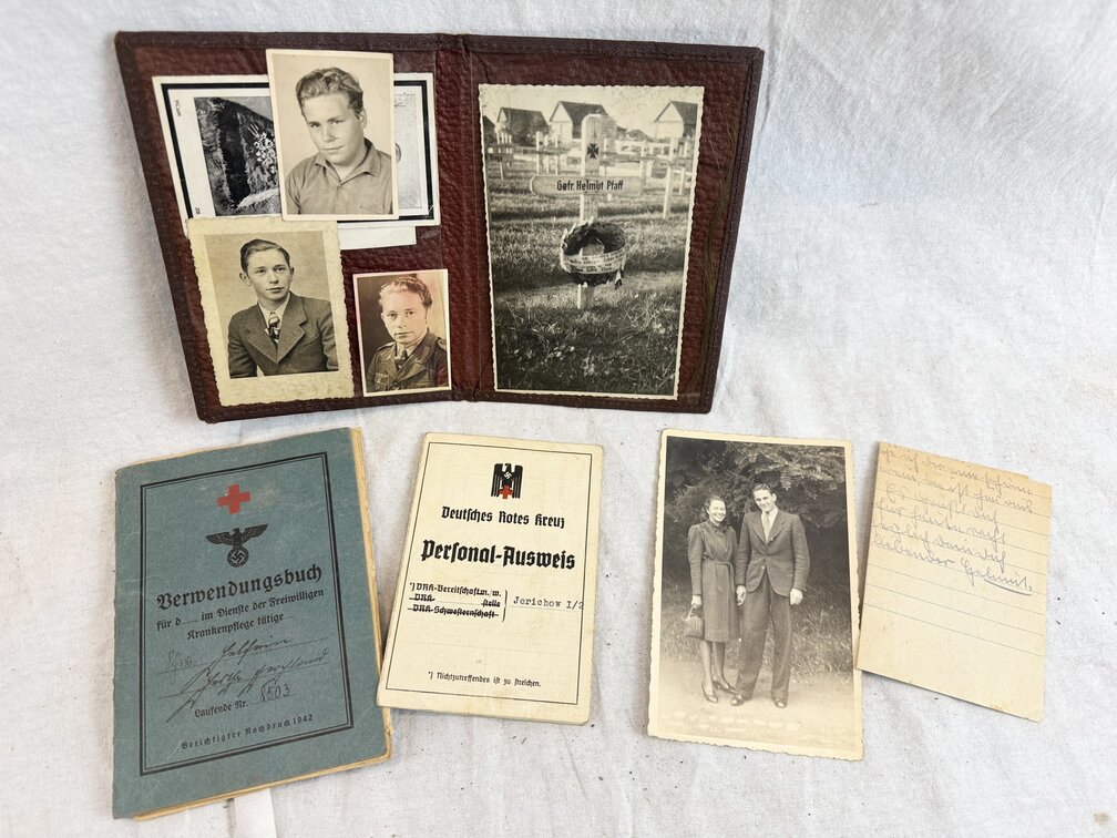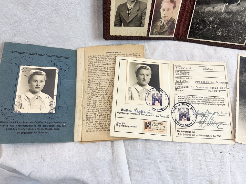 Scarce document group to a German Red Cross nursing sister. Comes with her Berwendungsbuch and Personal Ausweis. Both have the same pic. Also included is a death notice for a soldier and a pic of his grave. Aks Aka a letter which is quite hard to read. A unique grouping that does not show up very often but played a very important role.