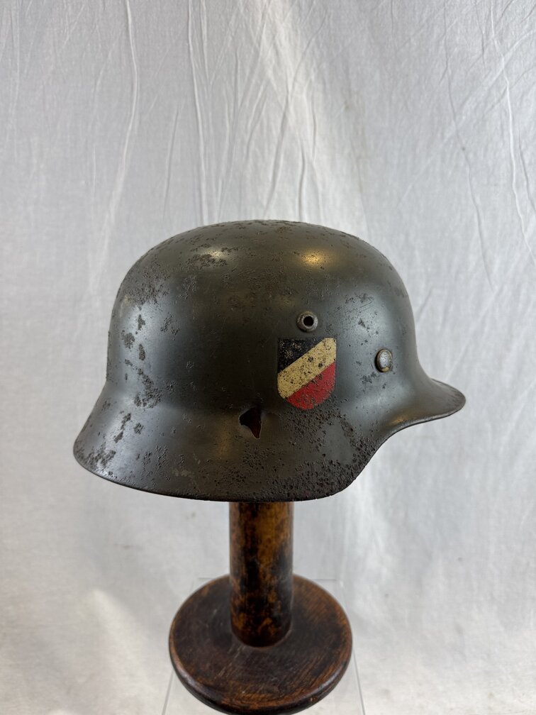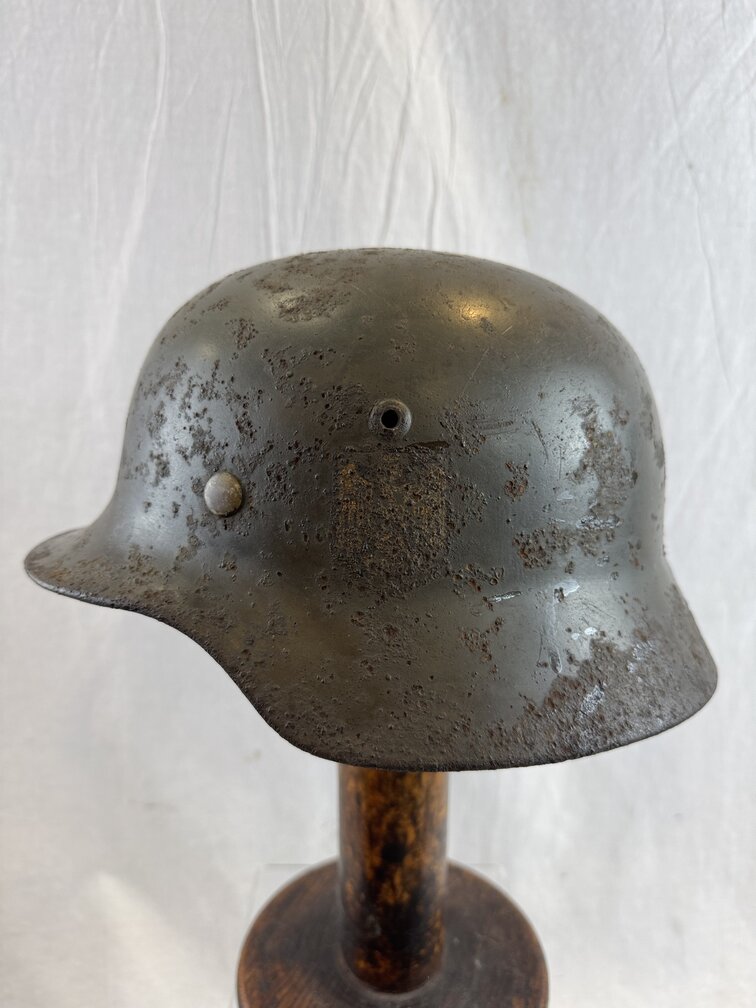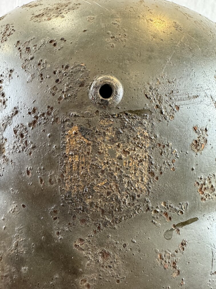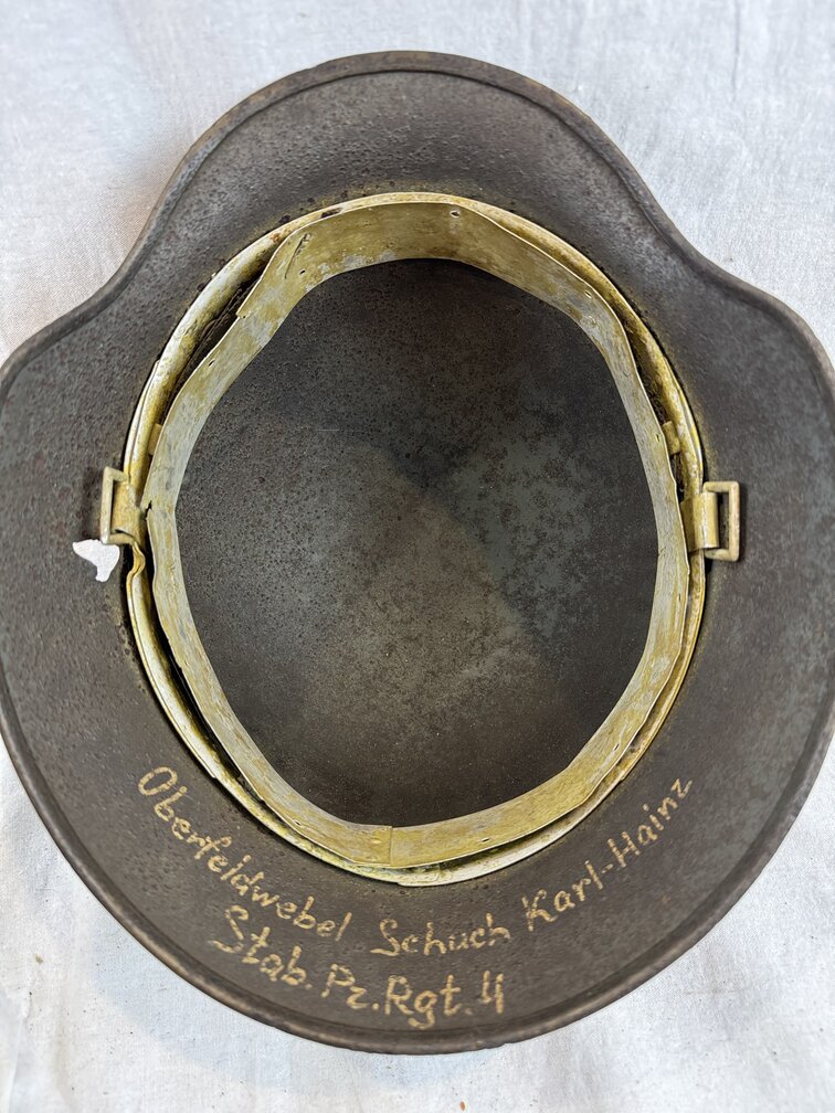German 2nd War M40 double decal helmet with battle damage. Still has Apple green finish. Unfortunately considerable rust over eagle decal. Liner and chinstrap missing. Named on rear skirt to an Oberfeldwebel Karl Heinz Schuch of Panzer Regiment 4. Shrapnel damage to shell below tri colour shield. Basically relic condition.