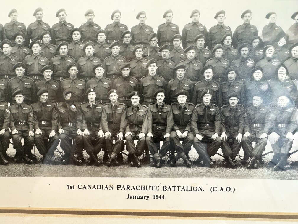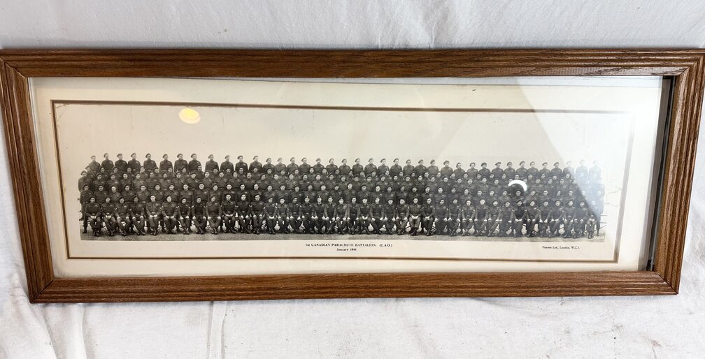 Framed original 1st Can Para regimental photo. Dated January of 1944. So likely these were all D-Day jumpers. Frame is loose and will need to be properly retaped. Measures approximately 33.5x12 3/4 inches in the frame. Probably the rarest 2nd War Canadian regimental photo.